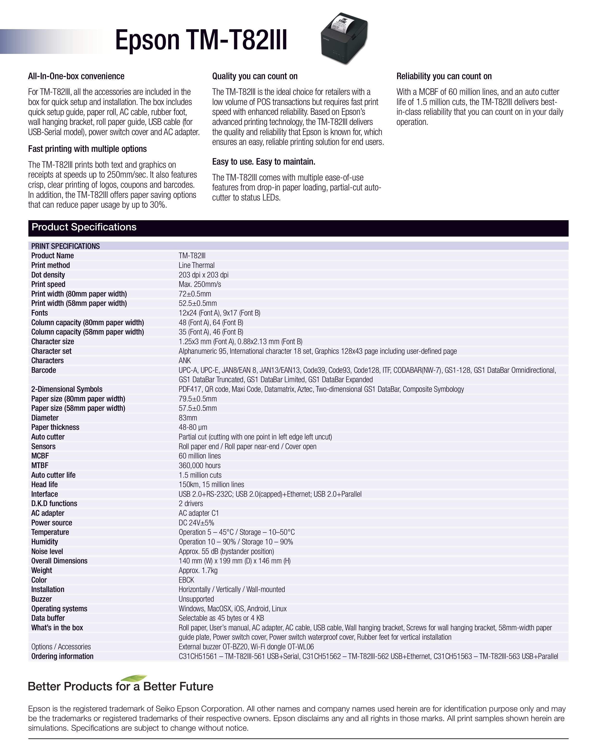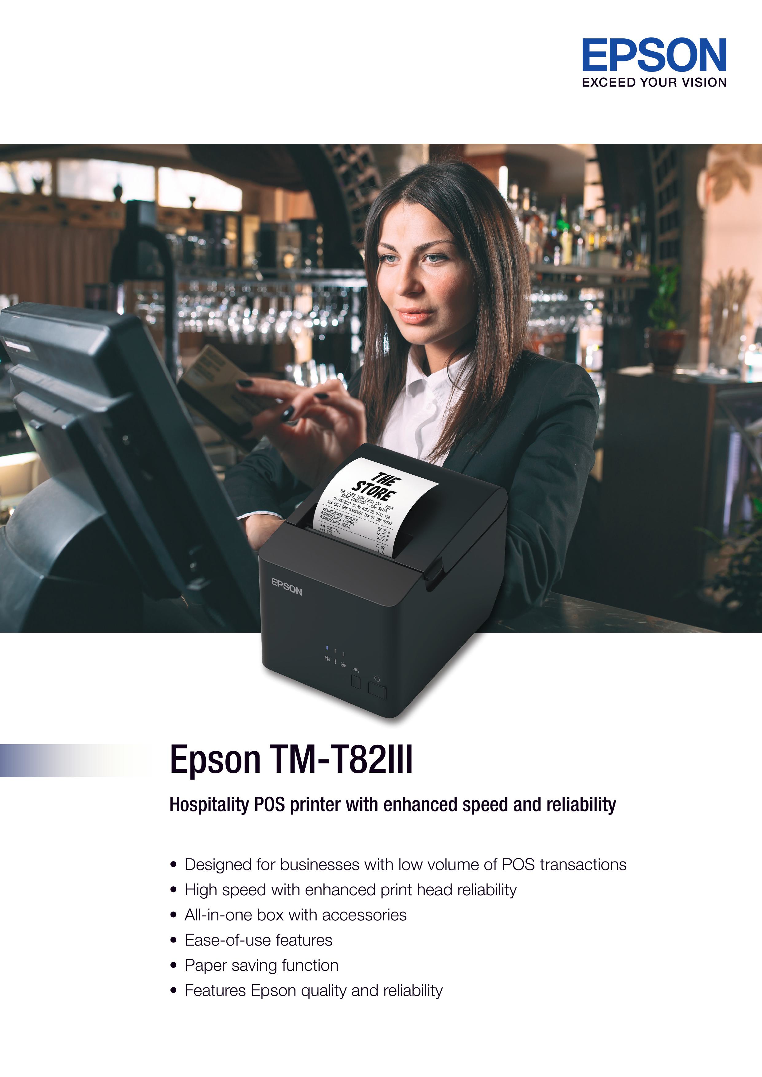 M-T82II New POS Receipt Printer from EPSON. Excellent Performance. Newer than all functions And better features developed from the TM-T82ii with the quality of printable text, graphics on receipts More crisp logos and barcodes The maximum print speed is 250 mm / sec and is easy to maintain. Suitable for businesses, shops, cafes, convenience stores. With automatic paper cutting system Supporting thermal paper width 80 mm. There are 3 types of connections to choose from. 1. USB + Serial 2. USB + Parallel 3. Ethernet (Lan)